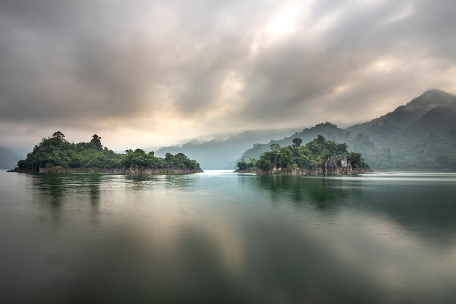 Lake Reflections – Rocky islands under tropical woods in pond surro #6136296